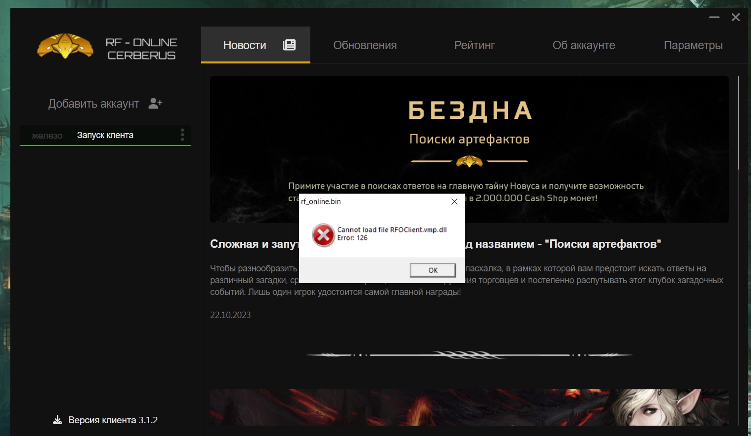cannot load file rfoclient.vmp.dll error: 126 Вот такая ошибка, чем лечить?