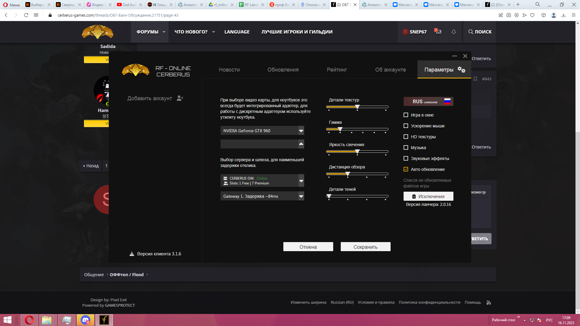 В папке с игрой файл R3Engine, его открывай блокнотом и вписывац нужное разрешение вместо старого( в двух строчках вверху увидишь)Так че , я докричусь с разрещением лаунчера? занаво скачал клиент и лаунчер, разрешений нет, хоть от имени админа хоть без имени админа. (ставит 1680 на 1050 - рофл) и меняет на рабочем столе разрещение на это же.Посмотреть вложение 15615
