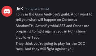Мы вам угрожаем ?Переведу для особо одаренных людей . Реч идёт о том,что маунг начал угрожать 3м тегам ,гансам ,изгоям,и ноук коменсов ( из за соры с онером ) и говорить что будет лить кор в пк . И сделал свой альянс с белками . И в итоге конечно же это всем не понравилось,это что такое за обращение к своей расе . С учётом того что мы не делали Альянсы а просто договорились играть в расу на данном этапе игры. Маунг мог просто поговорить со своей рассой и решить все вопросы заранее ( на что он ответил я не опредился с расой , а потом он определился и начал говорить что мы собаки.) поэтому я тут в теме и пишу что бы понять его . Кроме угроз что он всех в ПК я не чего не увидел, но при этом он не понимает что по факту задней не кто не даст и благодаря его политики вся раса будет в говне